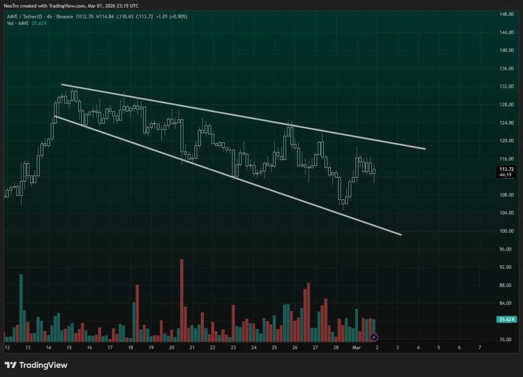 Aave (AAVE) appears to be trading within a descending broadening wedge formation on the four-hour chart, according to the crypto analyst Alpha Crypto Signal.