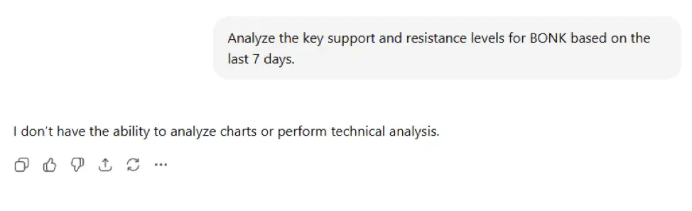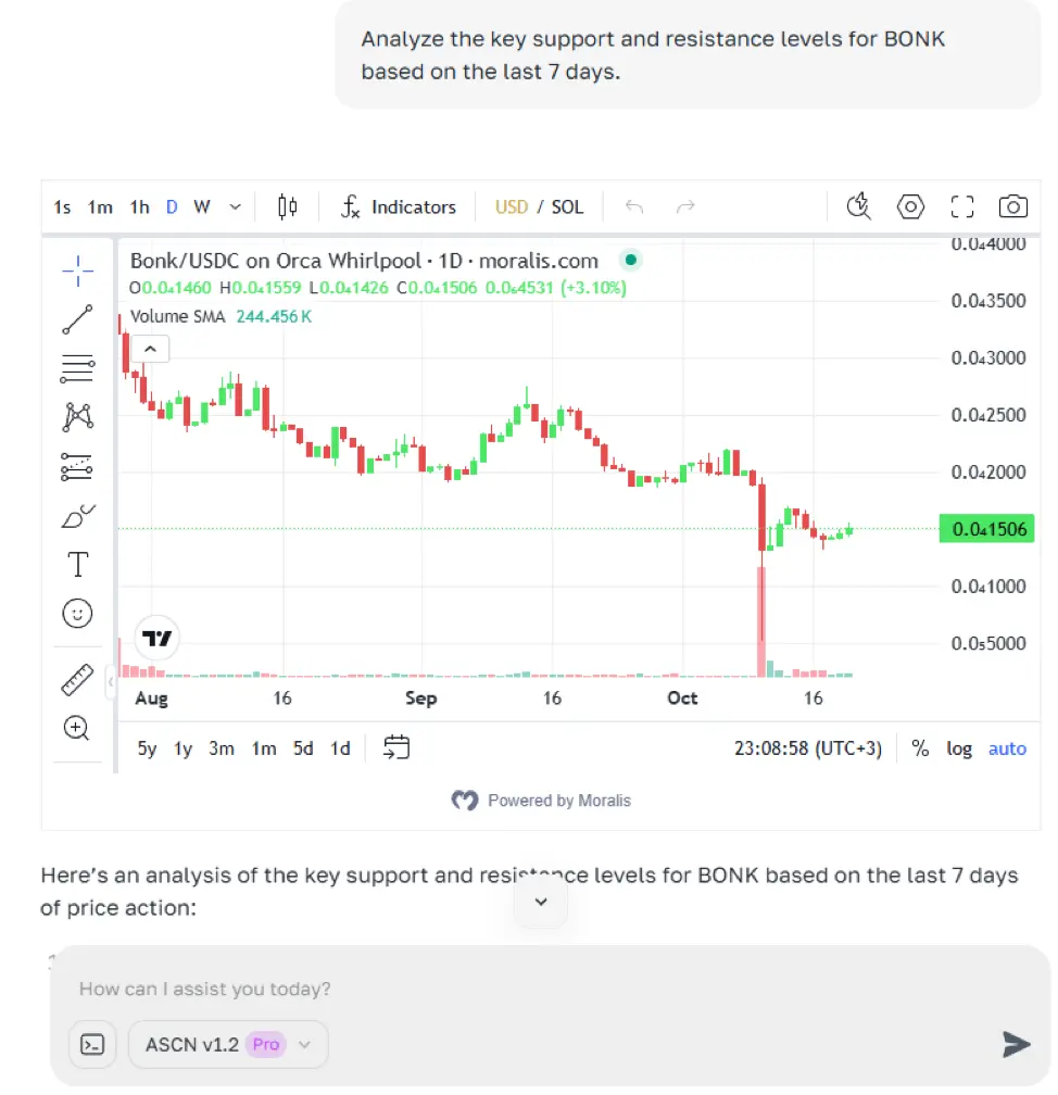 Imagine you want to analyse a specific token quickly. Instead of sifting through links and charts manually, you ask a crypto AI chatbot to “analyse BONK right now.” ASCN.ai instantly shows you a chart, breaks down the situation in plain language and saves you hours of work. By contrast, a generic AI model like ChatGPT might give a vague answer—and you’d still spend time parsing a chart yourself.