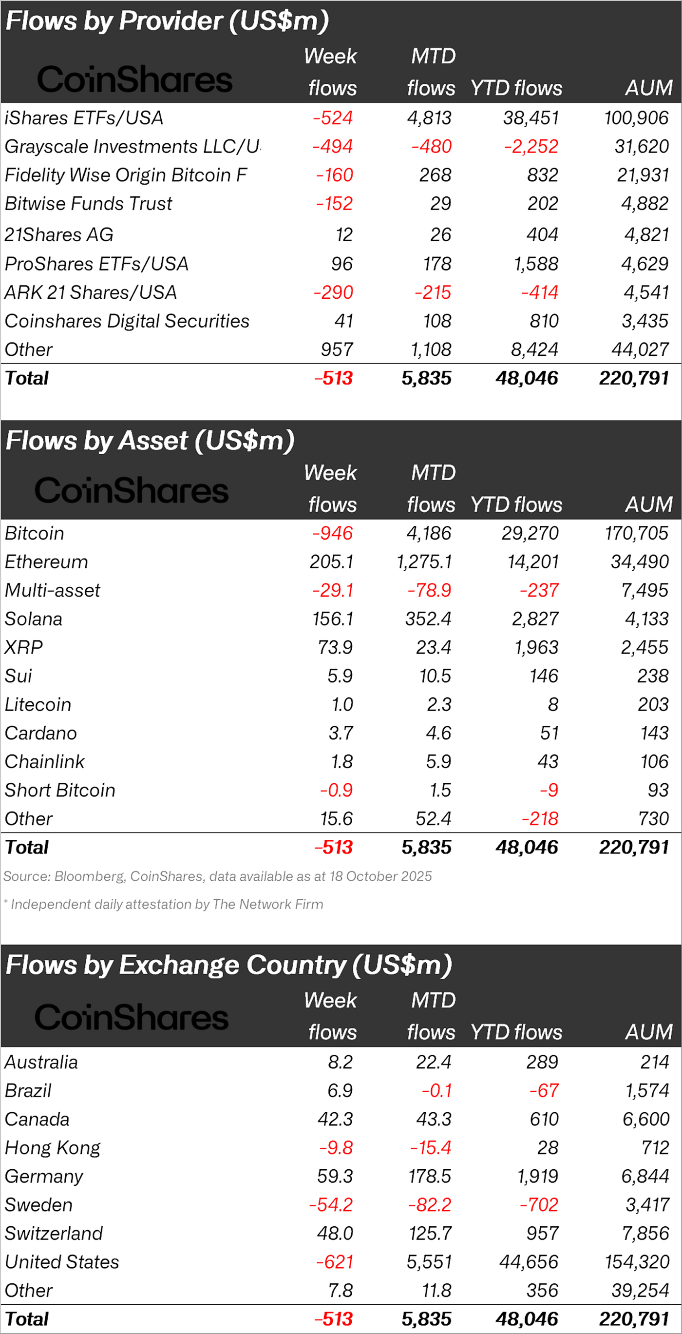 Crypto asset exchange-traded products (ETPs), led by Bitcoin, saw a total of $513 million in outflows following the liquidity issues on October 10.