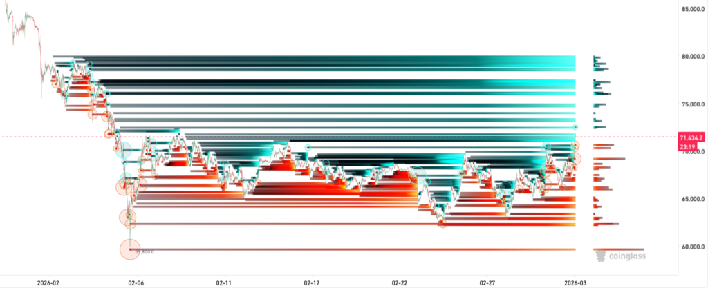 Following the volatile move down from $73,000 to $64,000, the data is now flagging the $72,000–$74,000 zone as the densest short-liquidation wall on the multi-week structure.