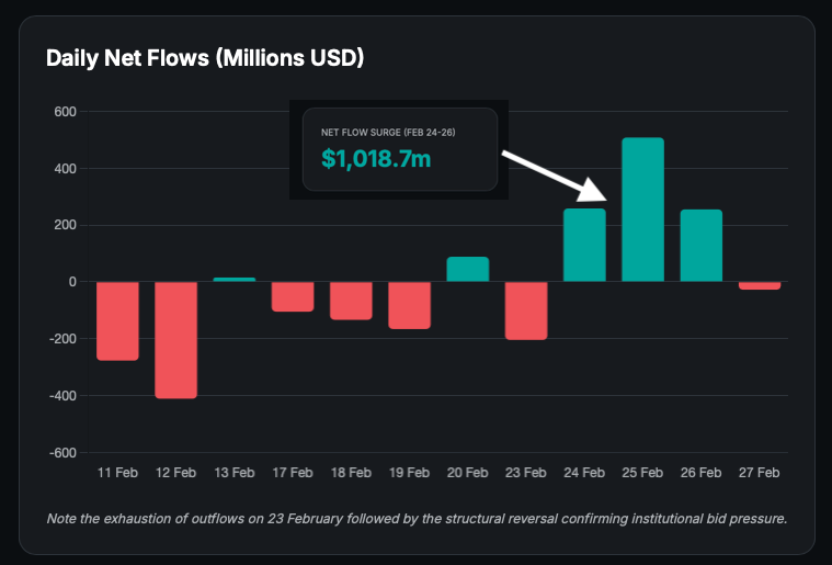 The $1.1 billion reversal from late February has not been a single-print event. This week on Monday and Tuesday, we have seen combined over $680 million in net inflows, confirming that institutional spot appetite remains the primary price driver.