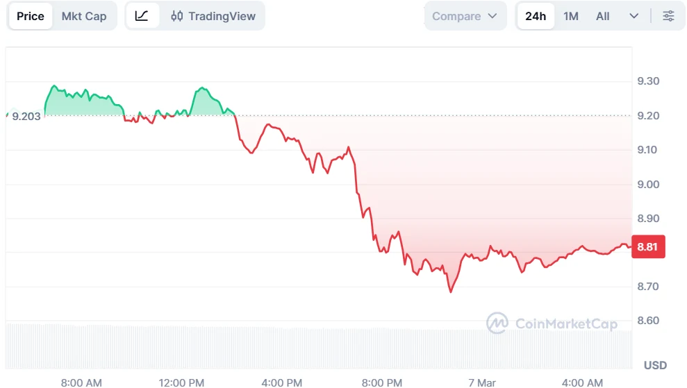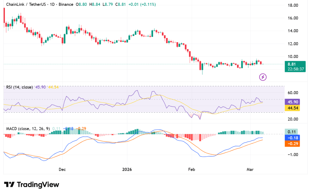 On Saturday, March 7, Chainlink (LINK) is trading at $8.81, showing a decline of 4.24% in the past 24 hours. The trading volume stands at $680.17 million, down 14.41%. The token’s total market capitalization stands at $6.24 billion, according to CoinMarketCap data.
