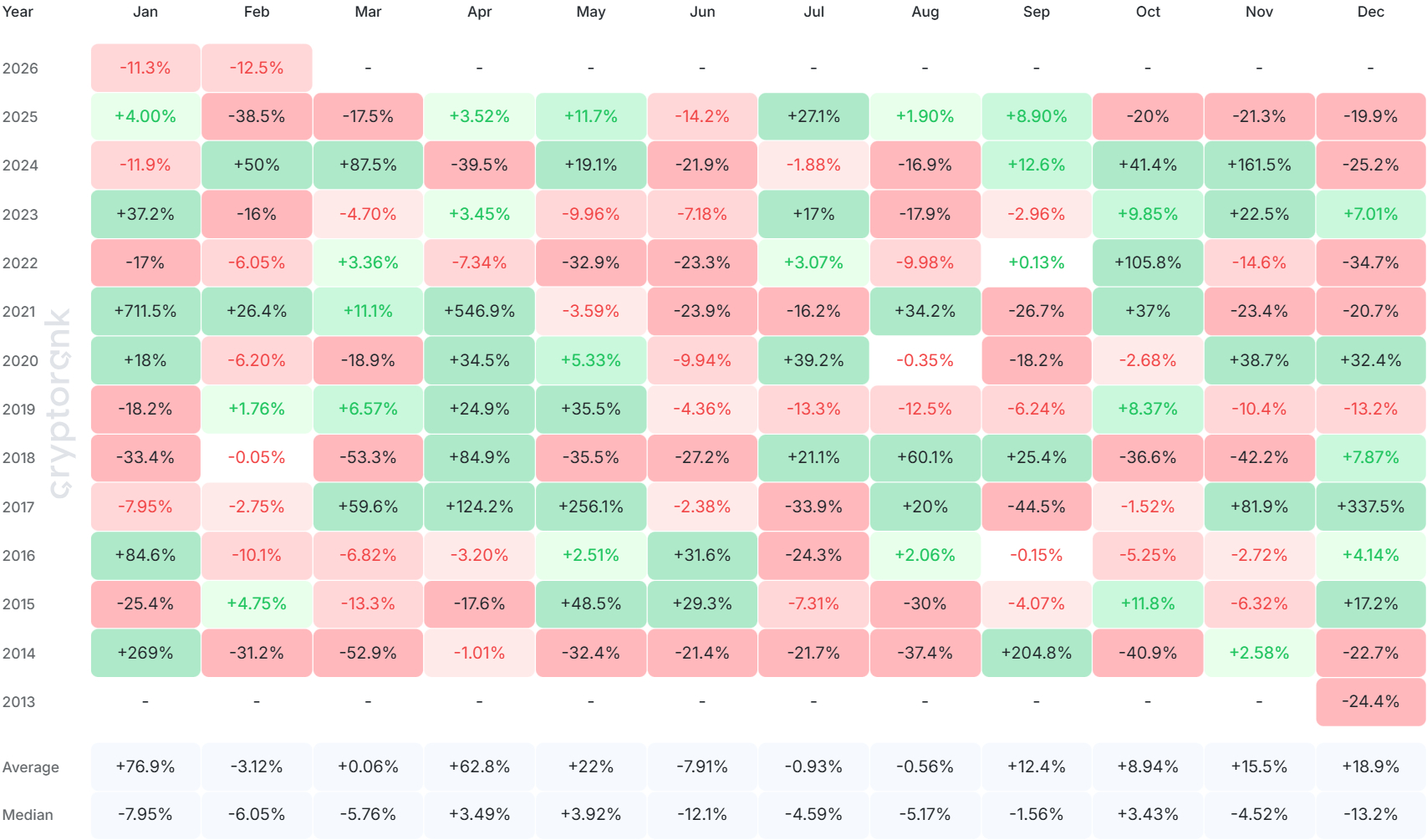 According to the monthly return heatmap created by CryptoRank, DOGE jumped significantly in price during January of both 2021 and 2022. This is due mostly to an almost unseen 711% price increase in January 2021 and multiple years of strong price movement throughout the month of January.