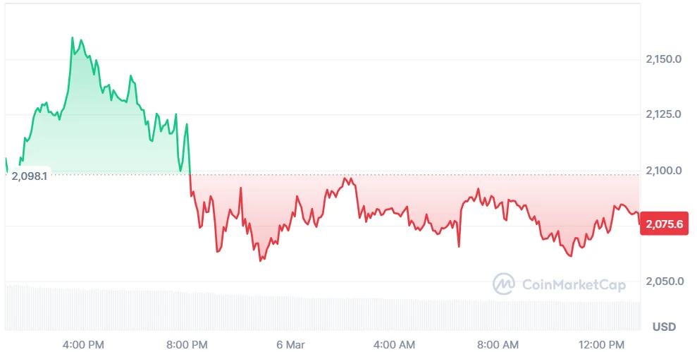 As of press time, on Friday, ETH is trading at $2,077, showing a 1.10% decline in a day. The trading volume is showing bearish, down 37.07%, and is currently standing at $20.65 billion. Over the last week, the coin has gained 1.91%, according to CoinMarketCap.