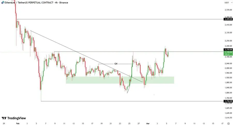 Analyst CryptOpus highlighted that “ETH has recently broken out of a descending trendline. This follows a strong reaction out of the $1,880-$1,920 demand zone, which has signaled a short-term momentum change.”