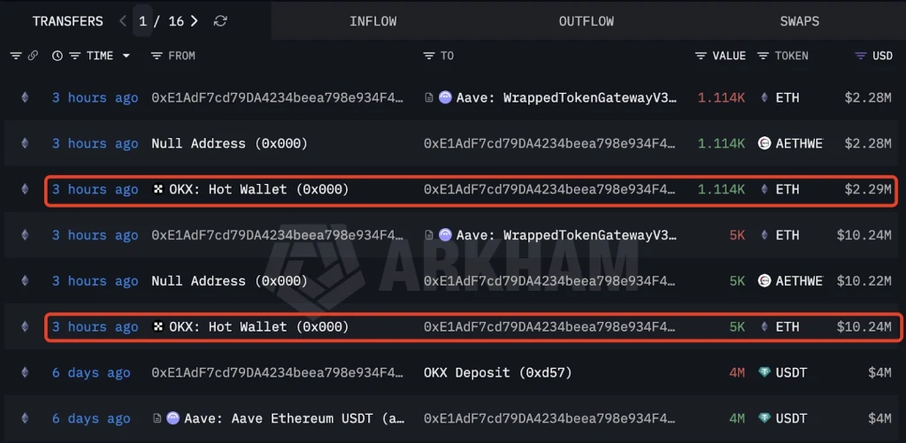 Ethereum rebounds and whale activity signals renewed market confidence on Tuesday, March 3. According to the data from Lookonchain, the wallet 0xE1Ad withdrew 6,114 ETH ($12.52M) from OKX just three hours ago and deposited it into Aave, likely for yield or collateral use.
