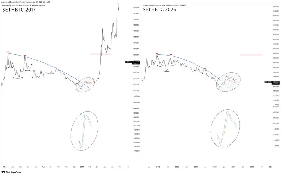 MARKS also pointed out that the current ETH/BTC pattern is similar to that of the prevailing market structure in 2017, when there were impressive gains in altcoins. This pattern might result in a shift in capital from Bitcoin to altcoins.