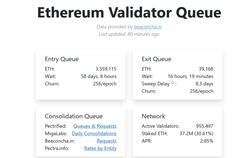 That backlog stretches activation times to roughly 60 days, according to data from ValidatorQueue.com.  The figure shows one of the longest queues since the Ethereum transition to proof-of-stake.
