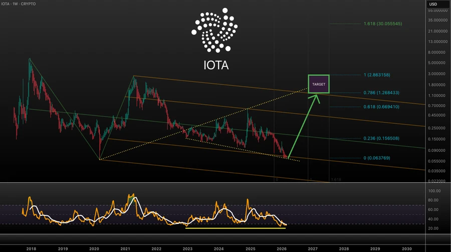Crypto analysts note that IOTA has remained within a descending price channel that has persisted since the cryptocurrency market cycle peak between 2017 and 2018. During this period, the asset has repeatedly formed lower highs and lower lows, reinforcing a prolonged bearish structure across multiple market phases.