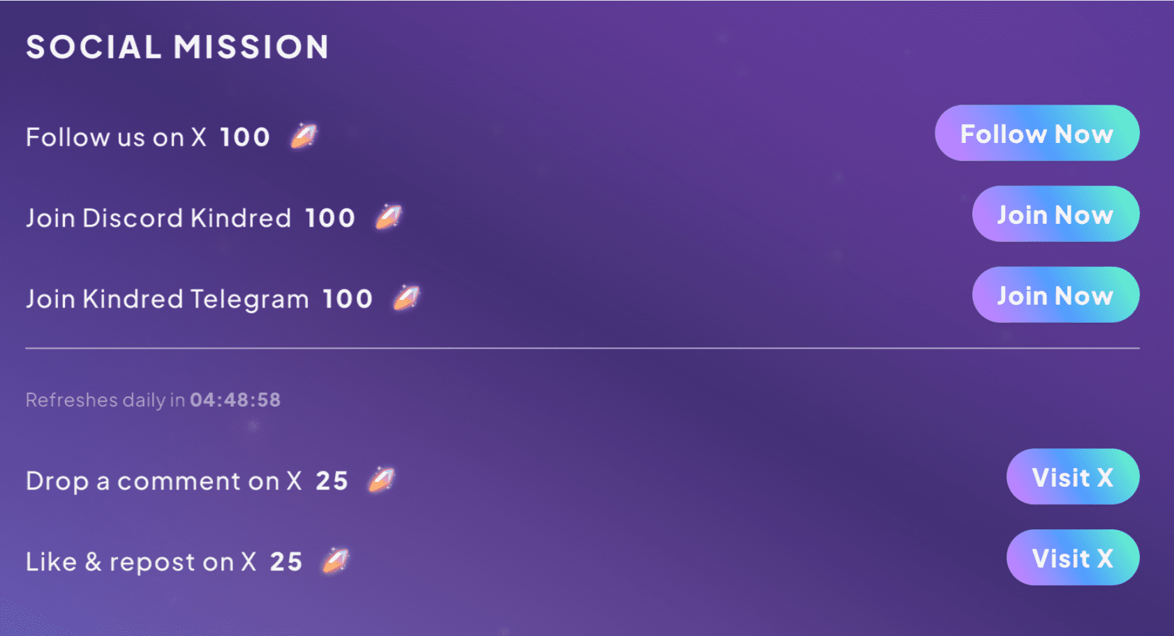 - Social Tasks: Follow, like, and repost Kindred Labs on X to collect points.