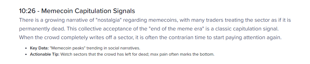 According to Santiment, this “collective acceptance of the ‘end of the meme era’ is a classic capitulation signal,” pointing out that when a sector of the market is deemed worthless, it is often the “contrarian time” to take note of.