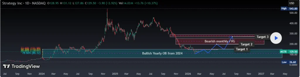 Beyond the short-term pattern, MicroStrategy’s price is also sitting inside a major higher-timeframe demand zone, indicating that the stock may be forming a base at this level.