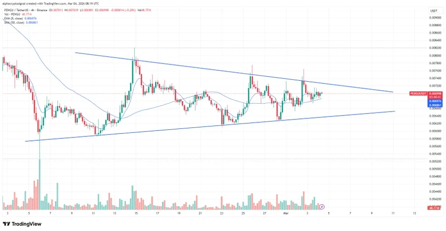 On March 4, 2026, in a technical insight, Alpha Crypto Signal wrote, “PENGU is consolidating in a very well-defined symmetrical triangle in the 4-hour time frame.