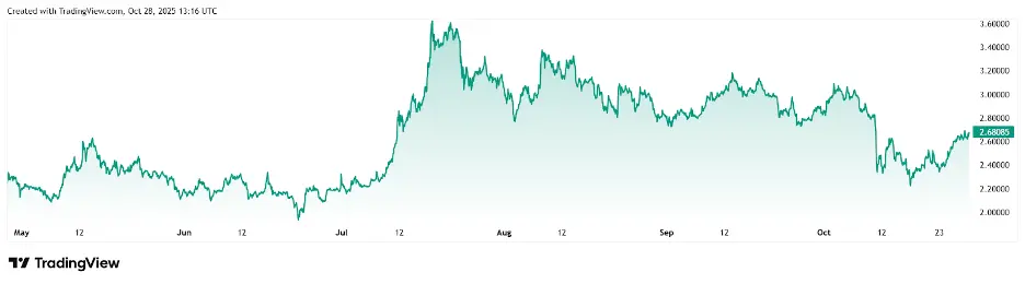 Ripple (XRP) currently trades around $2.67, maintaining a market cap near $150 billion. Despite being one of the most established cryptocurrencies, XRP’s price has been consolidating for weeks under key resistance zones at $2.80 and $3.00. While it remains a top choice for cross-border transactions, analysts note that its upside potential is limited in the short term.