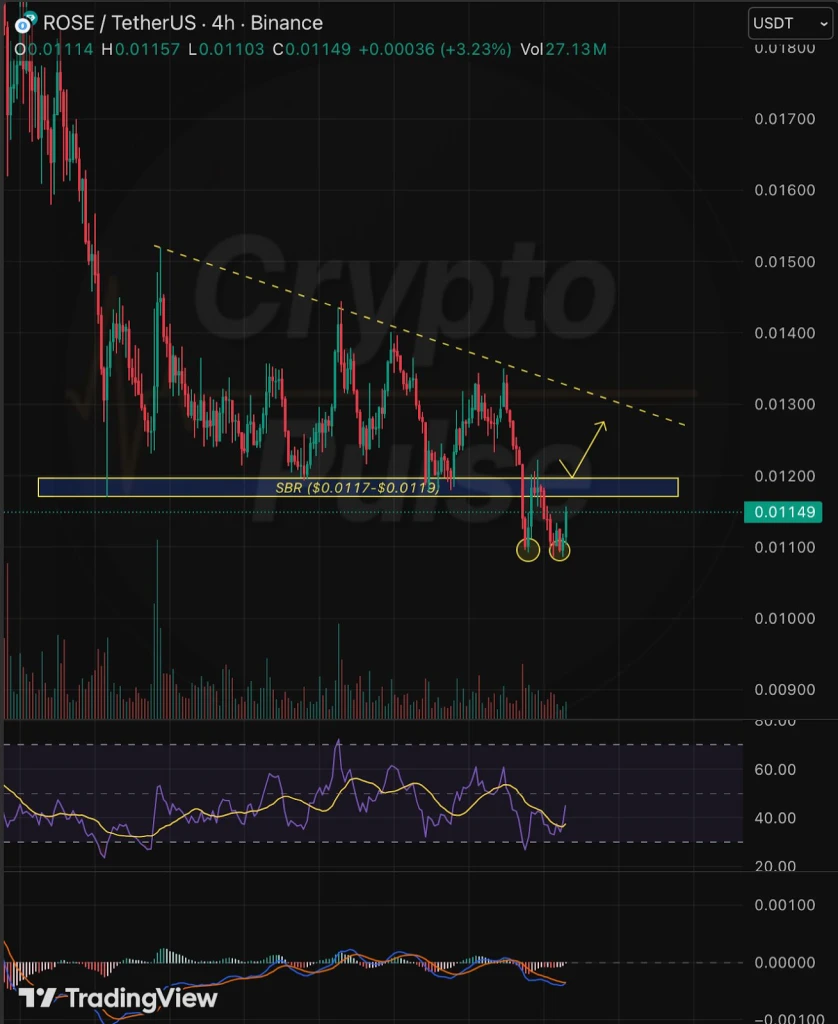 Technical analysis shows ROSE potentially forming a double bottom, a classic reversal pattern signaling a shift from bearish to bullish momentum.