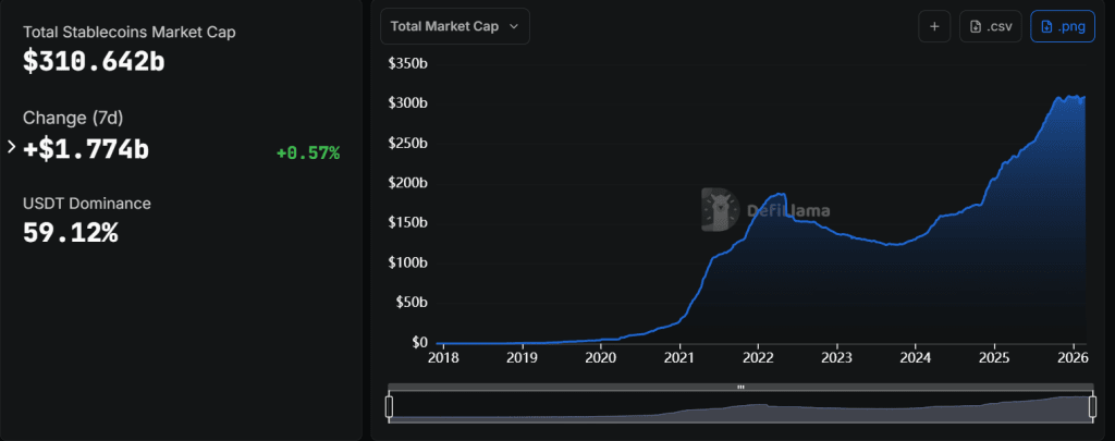 The stablecoin market is still growing. According to DefiLlama, the market capitalization of stablecoins stands at about $310.64 billion.