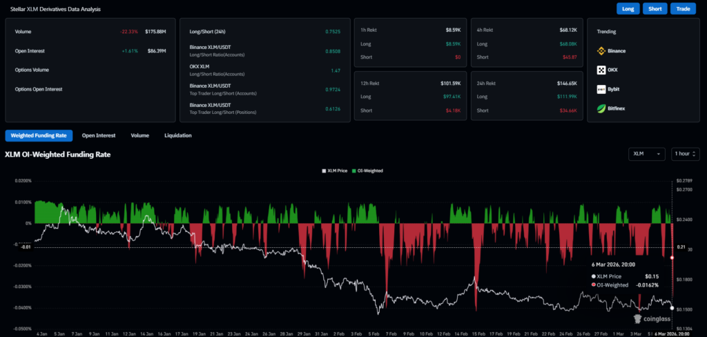 Liquidation figures reflected the latest market responses to price changes. Total XLM liquidations stood at $146.65K over the last 24 hours. Long liquidations made up $111.99K, whereas short liquidations amounted to $34.66K.