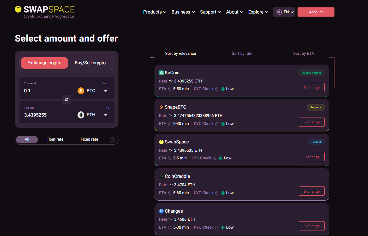 SwapSpace is a crypto exchange aggregator that compares live swap offers from trusted exchange partners, providing users with access to a large selection of cryptocurrencies at the most favorable market rates available at the moment of execution. Its marketplace model delivers transparent price discovery by presenting multiple partner quotes side by side, allowing users to choose the most advantageous terms for any asset pair.