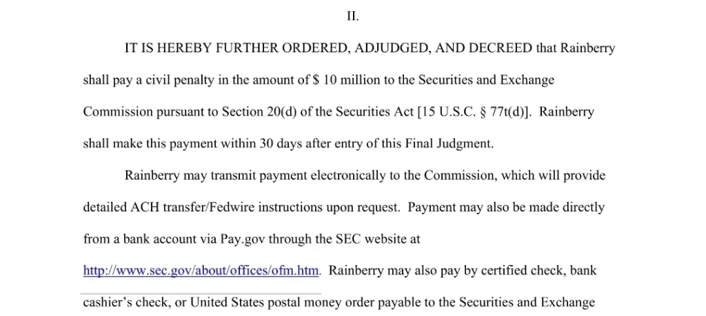 As part of the judgment, Rainberry has been ordered to pay about $10 million to the SEC. The payment must be made within 30 days after the judgment is entered.