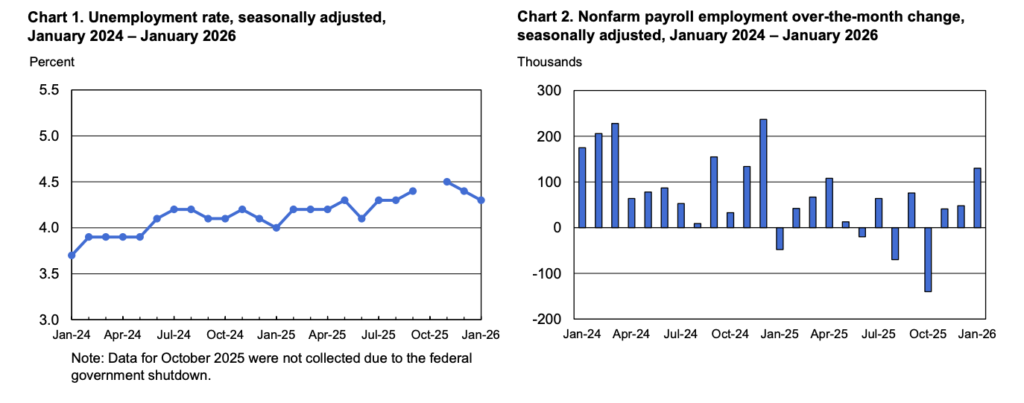 The labour market reinforces this “gradual stabilisation” narrative. Nonfarm payrolls rose by 130,000 in January, and the unemployment rate sits at 4.3 percent. Whilst prior job figures were revised lower by 898,000 through benchmark adjustments, recent hiring trends suggest a low-growth but non-recessionary environment. Wage growth remains firm at 3.7 percent annually, contributing to continued services inflation pressure.