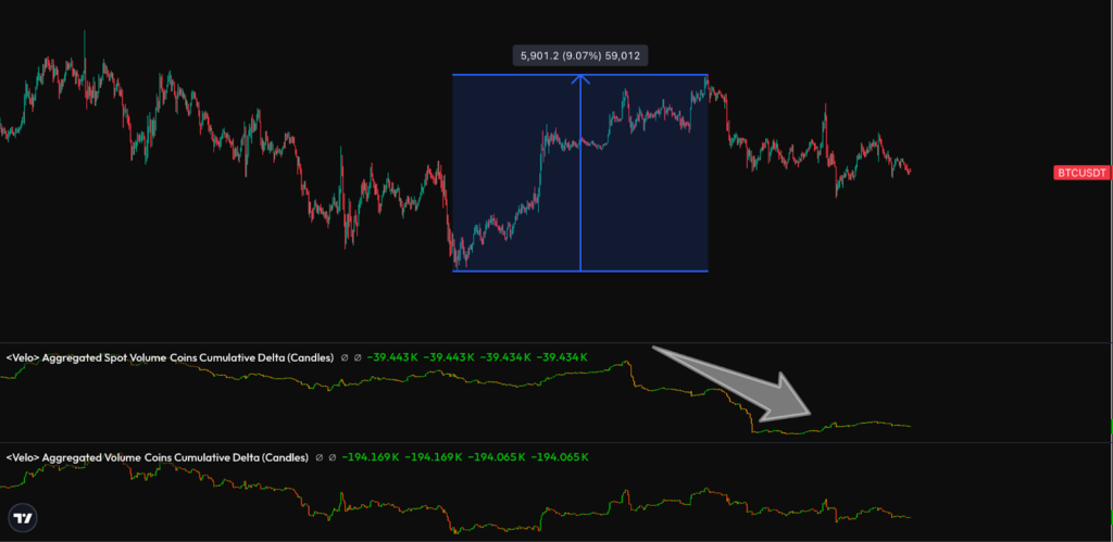 Following the CPI release, price dynamics shifted quickly. Aggressive spot buying — albeit for a very limited time — and a wave of short covering in perpetual futures drove bitcoin roughly 9 percent higher, even as open interest (OI) declined around 7 percent. The drop in OI during a price advance suggests that the move was largely driven by short liquidations and forced closures rather than fresh speculative positioning entering the market.