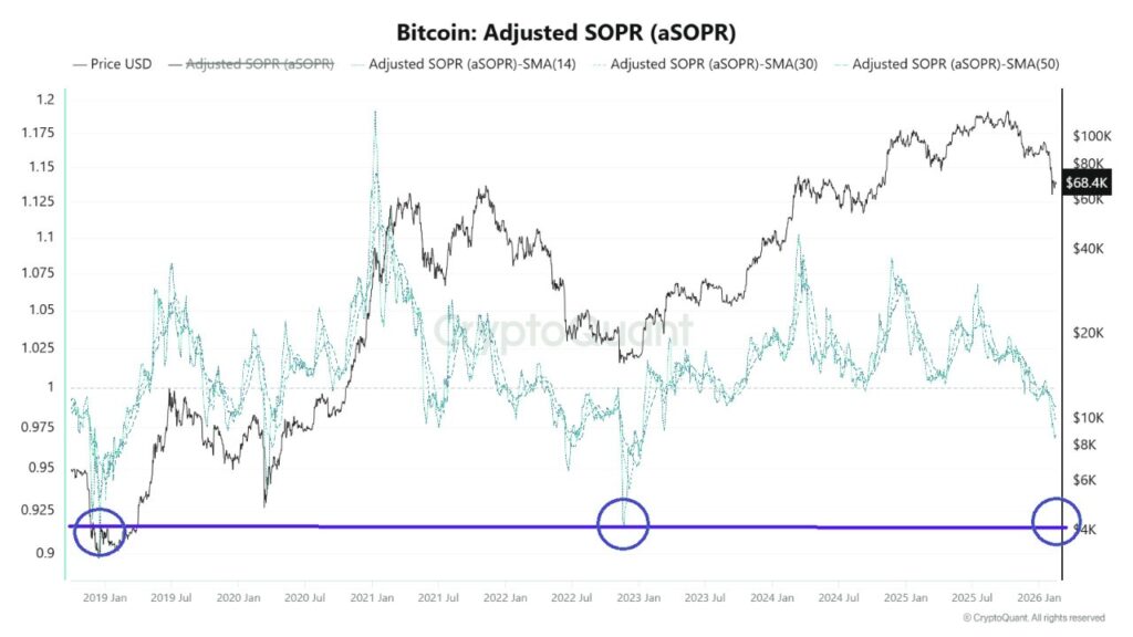 On-chain data adds a note of caution to the picture. Adjusted SOPR has fallen toward the 0.92–0.94 zone, a level historically associated with bear-market stress where a majority of coins are being spent at a loss. Unlike mid-cycle pullbacks where SOPR quickly reclaims 1.0, the current structure reflects sustained loss realisation. Whilst this does not confirm a full bear regime, it signals structural fragility rather than outright strength.