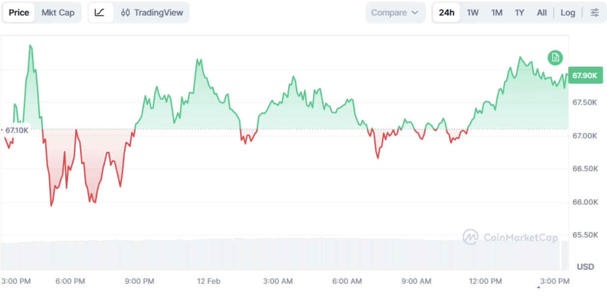 Bitcoin continues to struggle below the $70,000 threshold, trading in a narrow range between $67,740 and $68,020 as of February 12. Despite multiple attempts to regain upside momentum, price remains capped beneath key resistance, keeping the broader structure corrective rather than bullish.