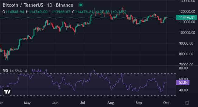 Bitcoin moves between 108819 and 115588 after another green week. The coin added 2.20 % in 7 days and 5.77 % in a month. Over 6 months the chart stands 37.59 % higher, a solid uptrend. Short term traders see price pressing toward the upper part of the band as buyers keep control.