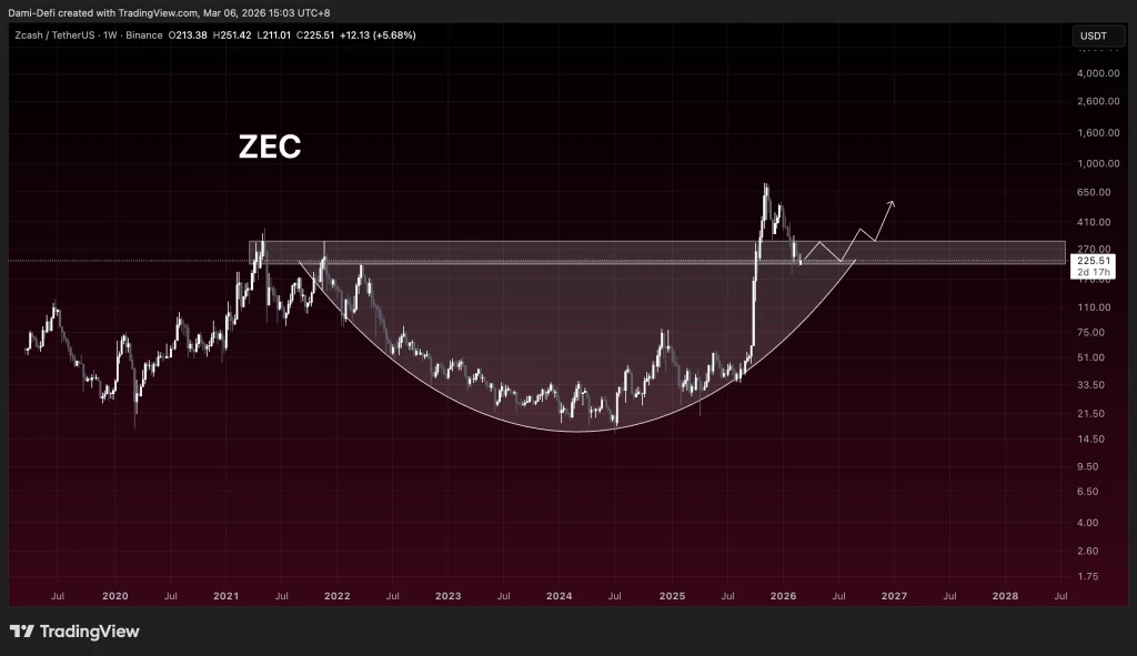 The weekly ZEC chart shows a large cup formation, a bullish long-term pattern. Price dropped from around $300 in 2021 to nearly $20, then slowly recovered.