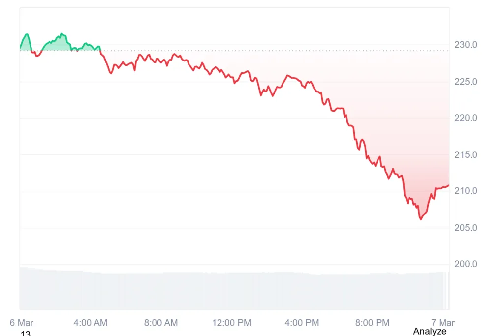 At the time of writing, ZEC is trading at $210.17 with a trading volume of $283.26 million, declined by 8.81% over the last 24 hours. Furthermore, its market capitalization stands at $3.48 billion, pushing the token to a critical stage.