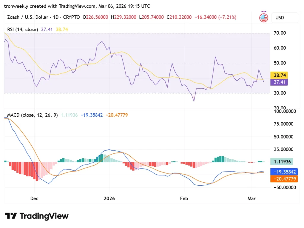 At the time of writing, ZEC is trading at $210.17 with a trading volume of $283.26 million, declined by 8.81% over the last 24 hours. Furthermore, its market capitalization stands at $3.48 billion, pushing the token to a critical stage.